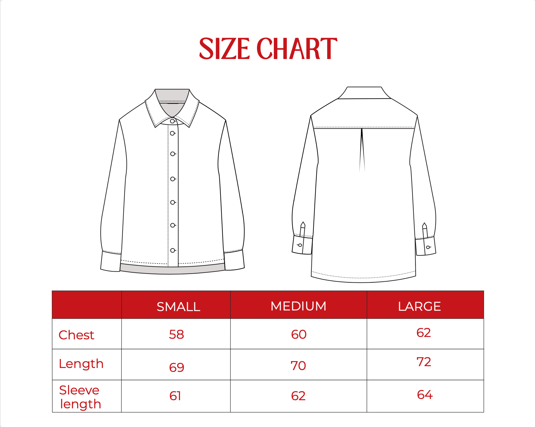 Classic collar, full button-up front closure, curved hemline, full-length sleeves with buttoned cuffs