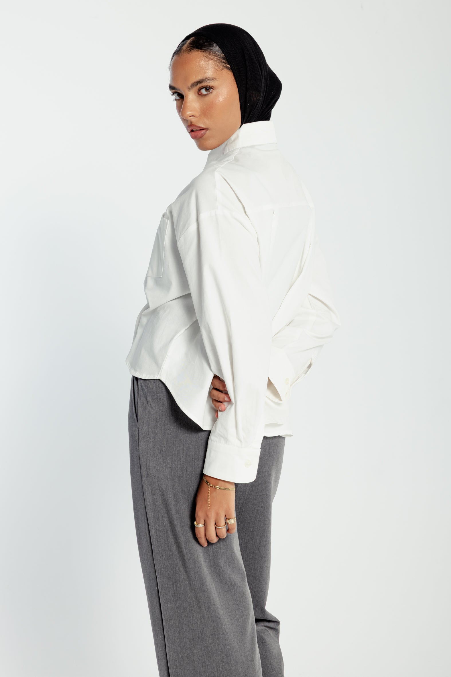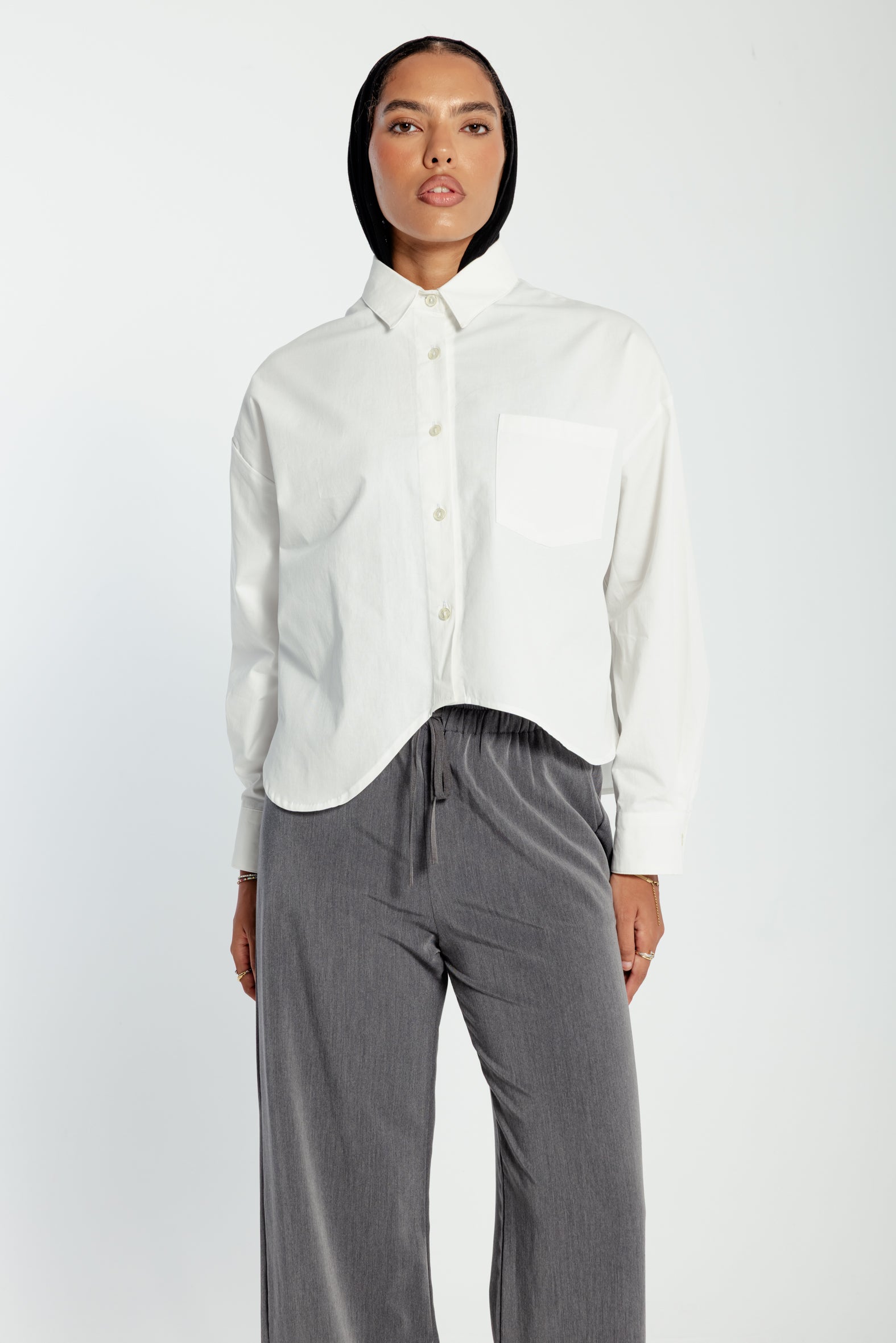 Cropped silhouette — relaxed yet structured with a unique wavy hemline for a modern twist