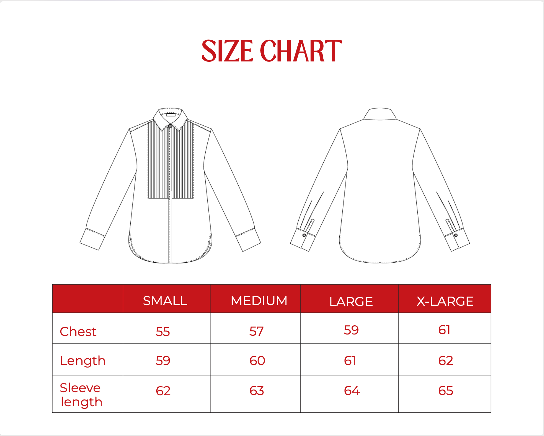 Tuxedo-style pleats at the chest (piano shirt–inspired), classic collar, full-length sleeves with button cuffs, front button-down closure