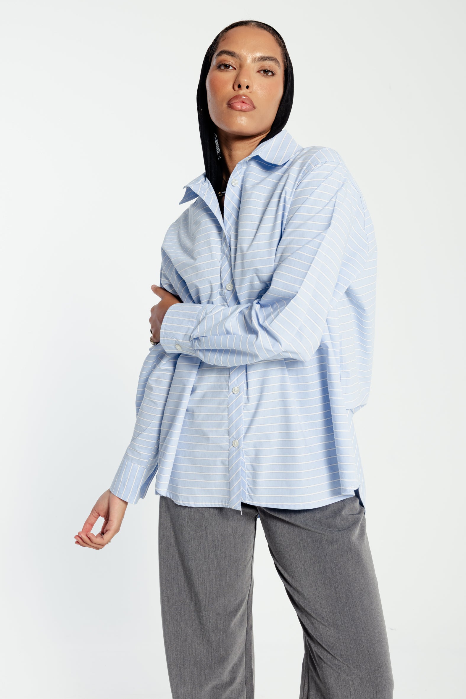 Oversized silhouette — relaxed button-down shirt designed for ease and effortless style, with unique stripe play and subtle detailing