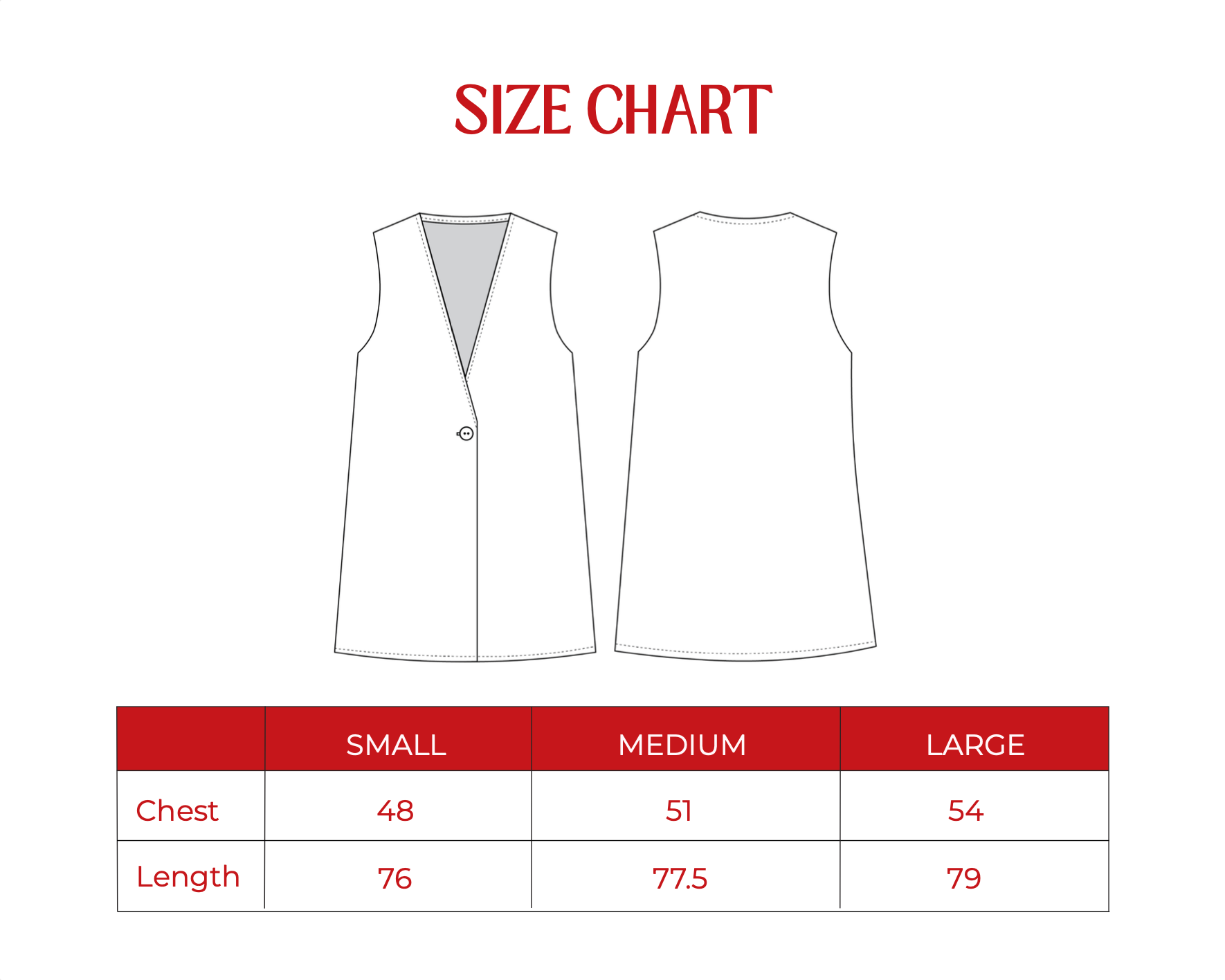 Our size chart lists half measurements of the actual sizes.