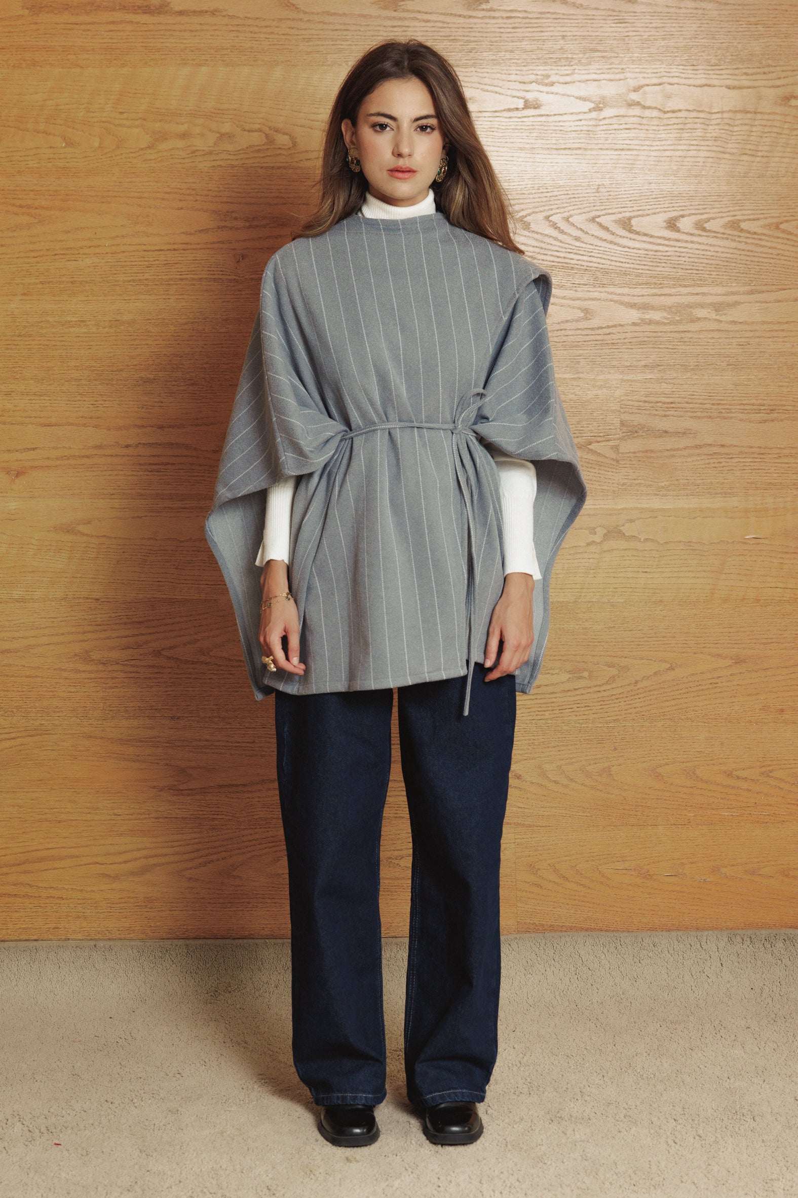 Relaxed silhouette with a front asymmetric design that transitions into a scarf detail at the back