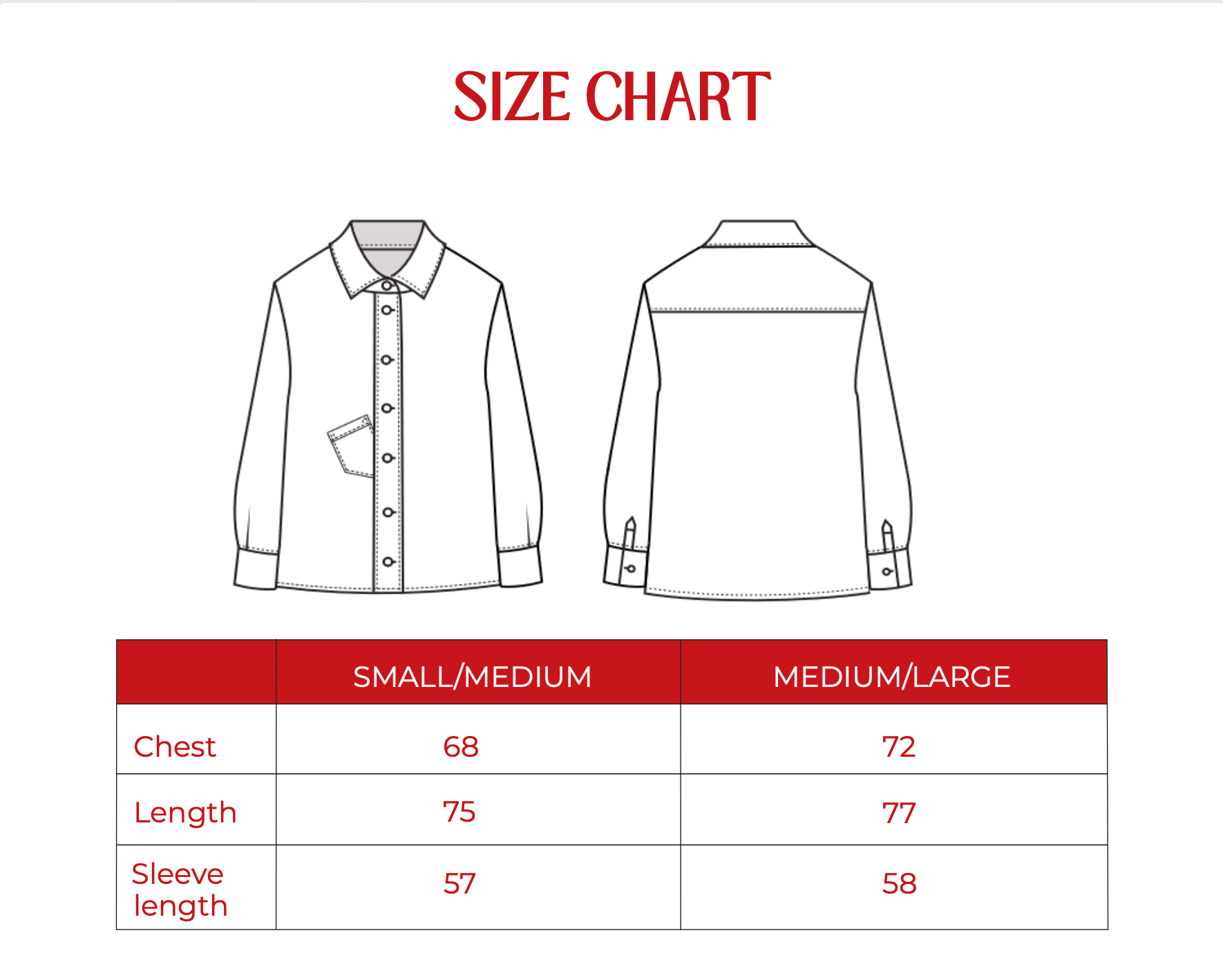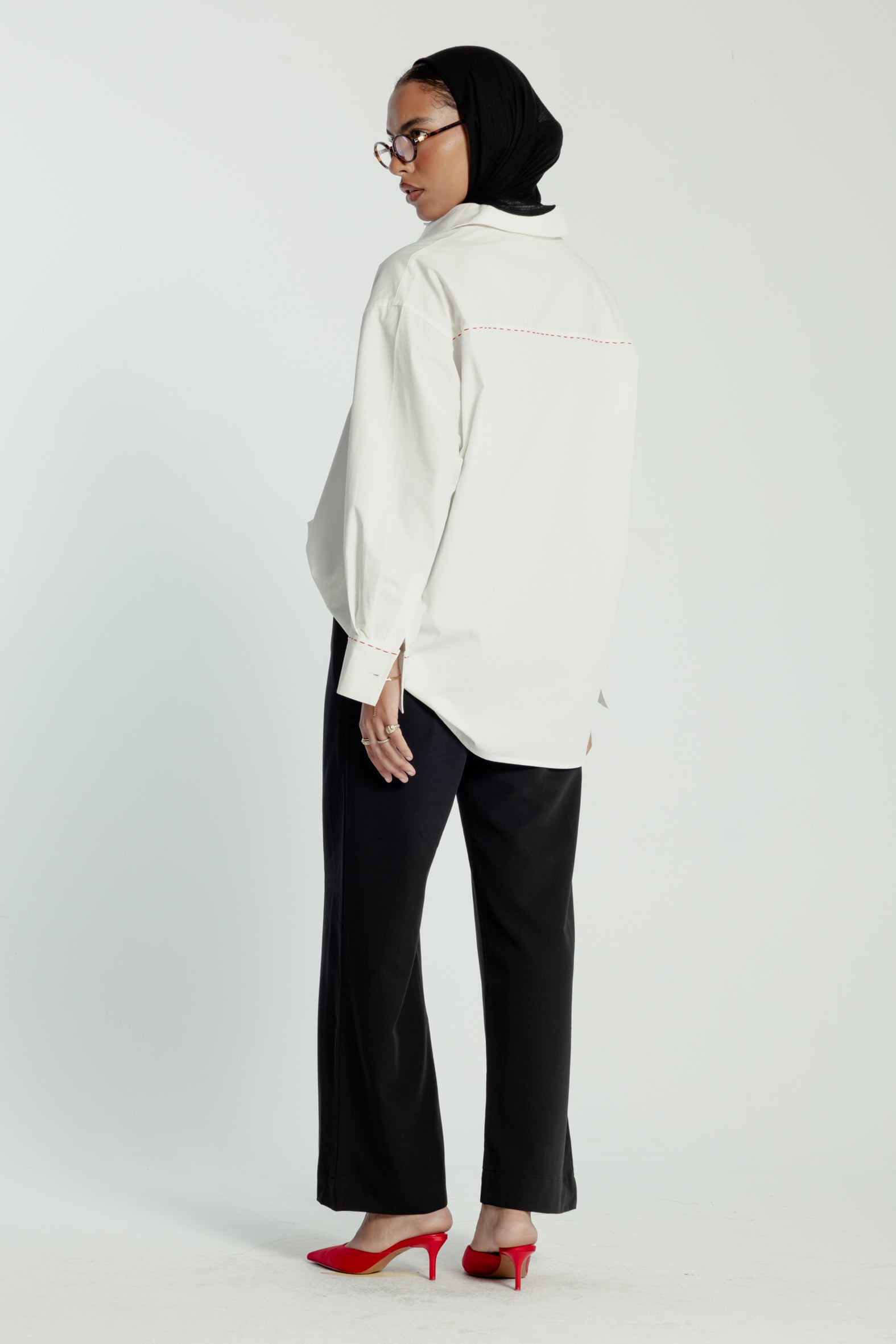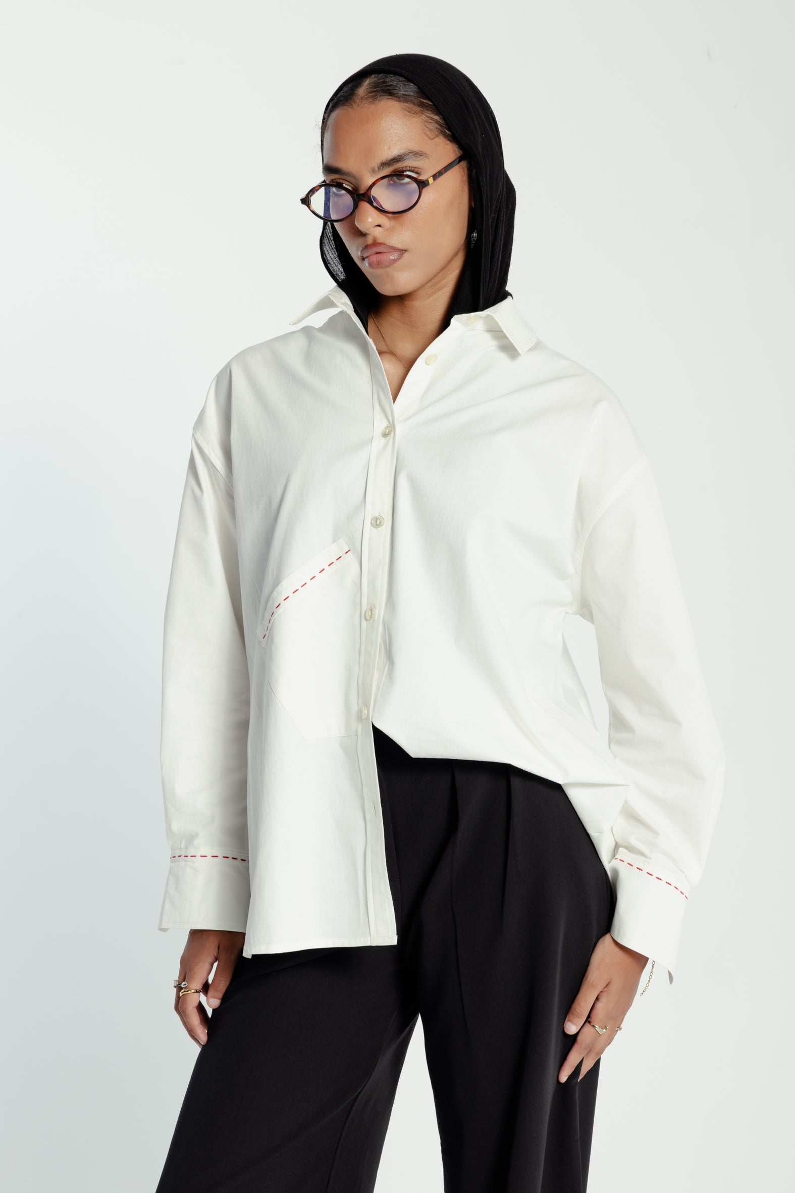 Classic button-up shirt with pointed collar, full-length sleeves with buttoned cuffs, asymmetric stitching scattered across the body for a unique textured look, front asymmetric side pocket, and curved hemline